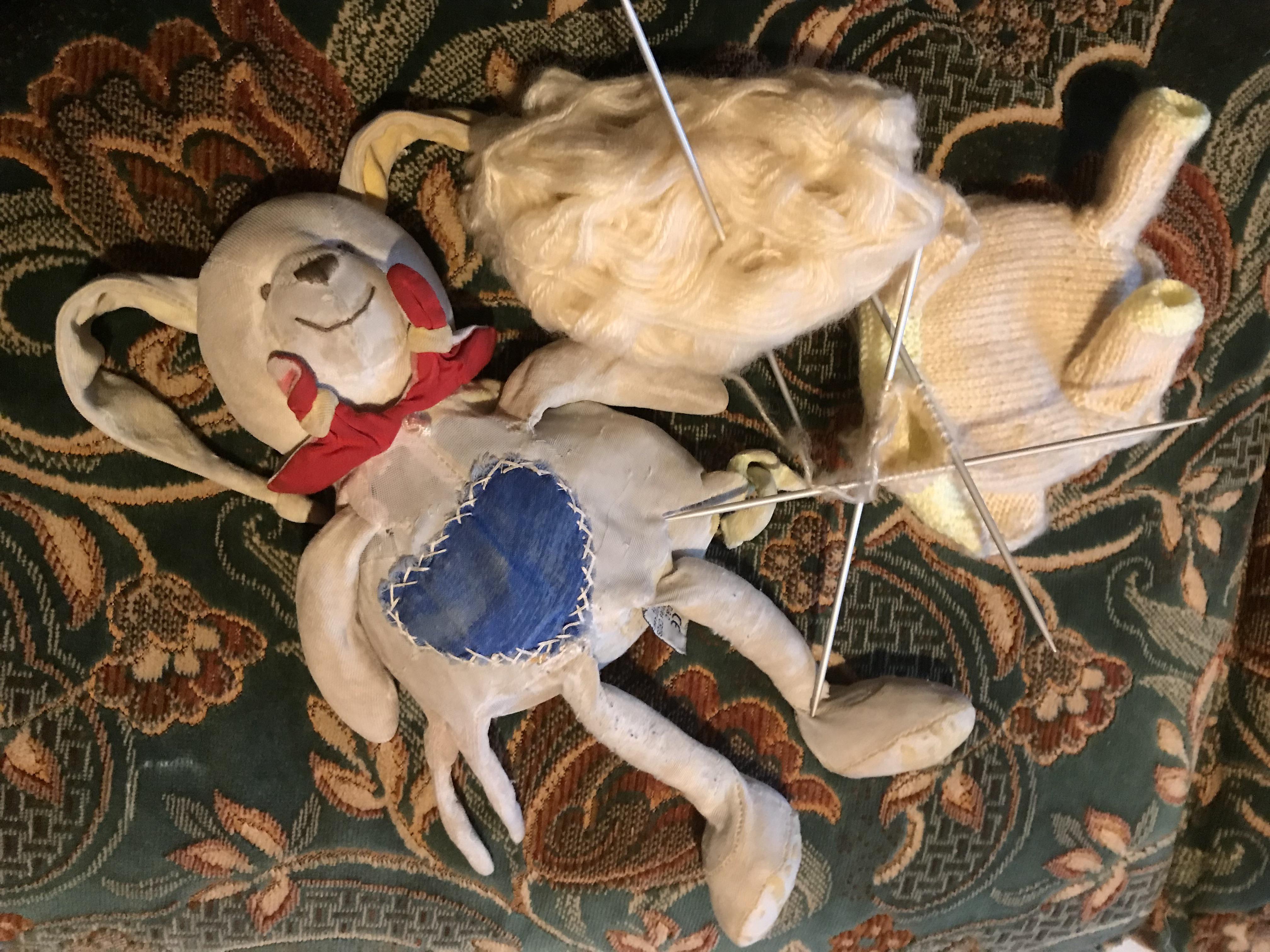 Et je m’étais engagée, sans imaginer le temps nécessaire, et sans même savoir comment j’allais m’y prendre, comment résister à la demande d’un petit-fils, qui me demandait si j’avais le temps. Ce n’était pas la première fois que Doudou Oreille avait besoin d’aide, cependant sa situation ne s’améliore pas avec l’âge. Cette fois, il s’agit vraiment de cacher les outrages du temps.